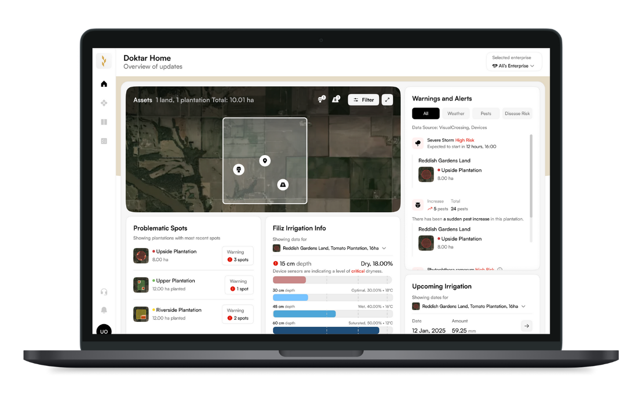 Doktar App is a digital agriculture platform that empowers farmers, agronomists, agri-enterprises, agricultural consultants and sustainability teams in the agri-food value chain to make data-driven decisions for smart farming and precision agriculture. Combining field-level insights with advanced agriculture technology, it brings all Doktar services into one mobile app. It provides real-time agronomic advice, crop monitoring, risk alerts and input optimization that help farmers adopt smart farming techniques and apply precision agriculture for better efficiency and sustainability.