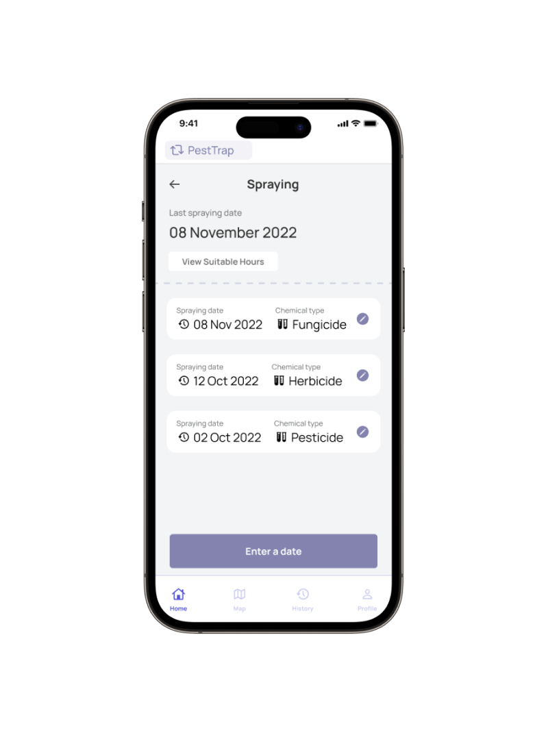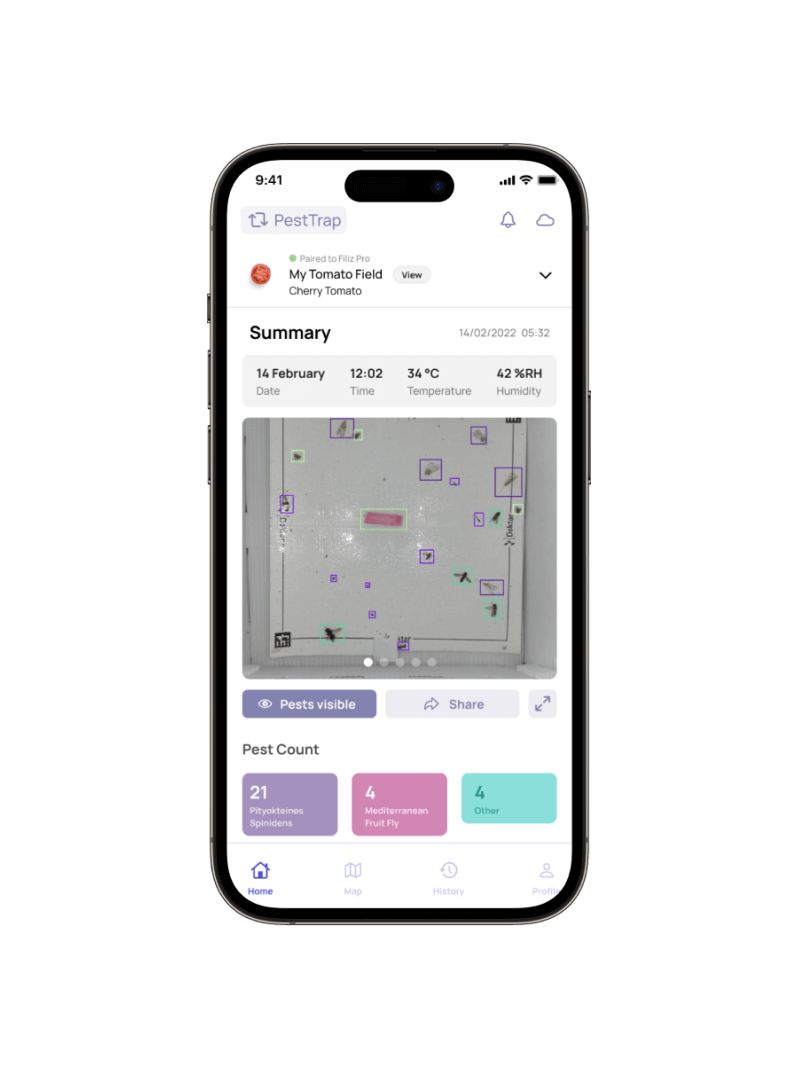 PestTrap captures daily images of pest populations and tracks them in real time, sending push notifications when pest levels reach a risk threshold. Automized pest detection is crucial for protection as it allows for timely and effective spraying.