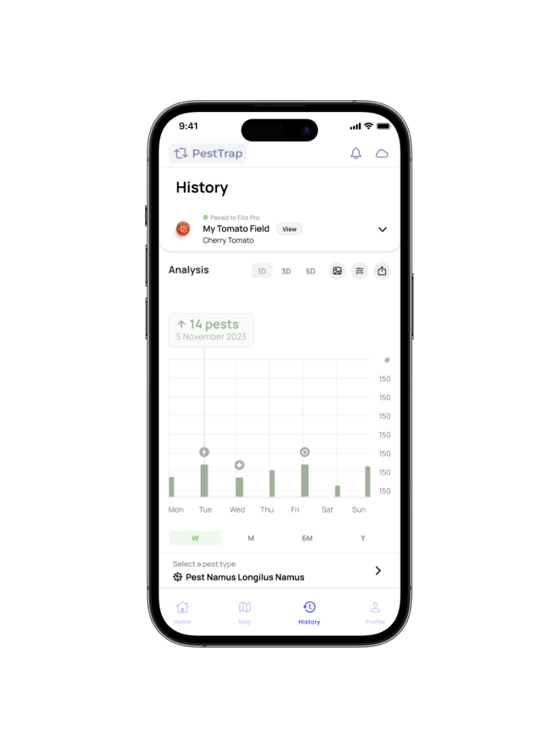 Our advanced deep learning algorithm accurately detects pest type and density, identifying even small insects such as Tuta Absoluta. PestTrap captures two daily images of the trap and plots population changes in real-time.